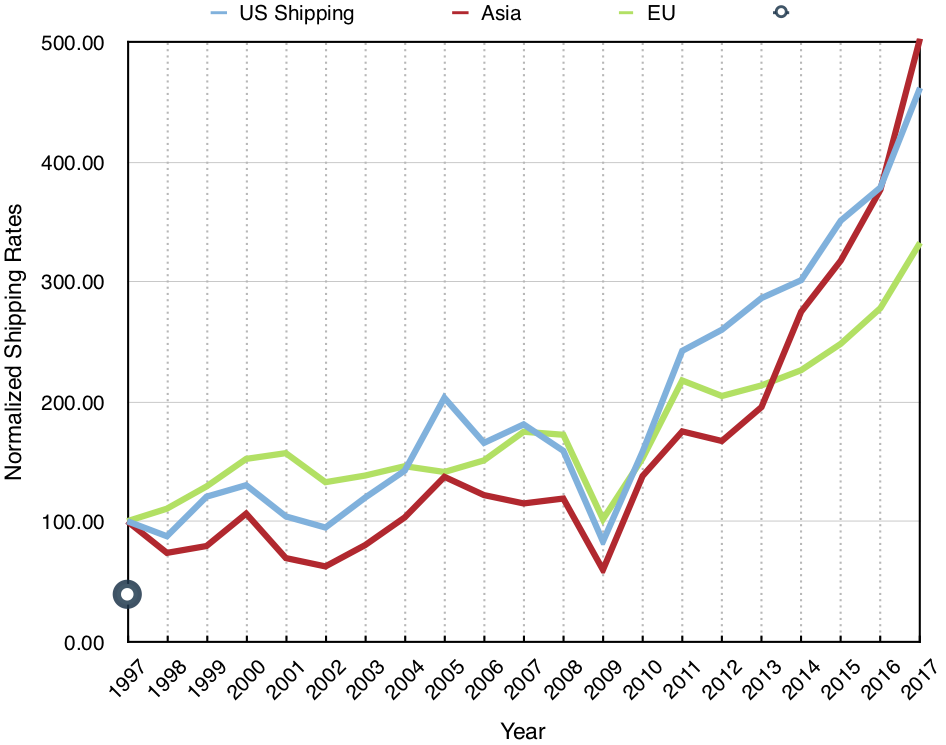 The sales figures across all regions continue to increase. The normalized sales curves since 1997 are shown below for the regions Asia, US and Europe. Every region has robust growth but it is clear that the biggest growth, in particular since 2009 are in Asia/China.